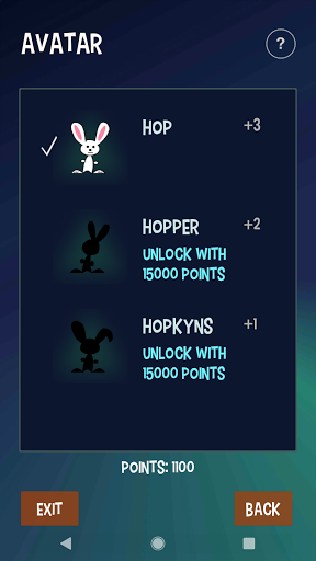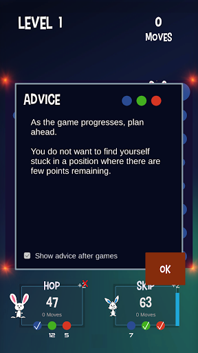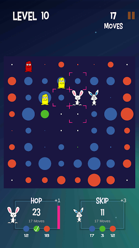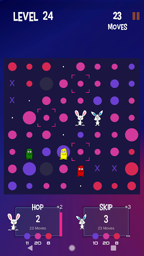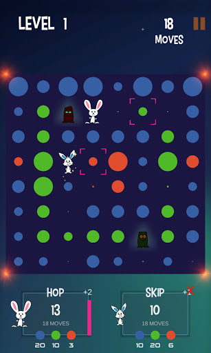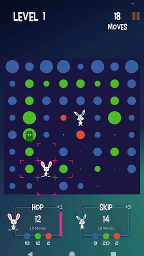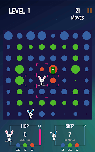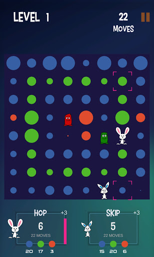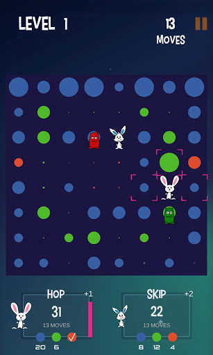 You play this turn-based, puzzlelike strategy game as a rabbit named "Hop". Your AI opponent is "Skip". The object of the game is to jump around on the game board, score points, and beat Skip. Also on the board are playful AI creatures called “Thump". Some move about randomly while others actively try to block your moves. And beware the red ones. If they touch you, you are thumped and lose a turn.