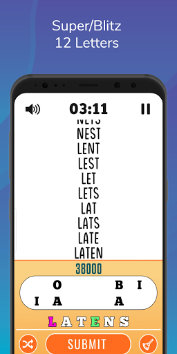 A supersized game mode in which you are given 12 letters, two of which offer bonus points - 2x and a 3x word score multipliers. In this mode, time increases as you get words, so you can rack up a super score!