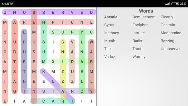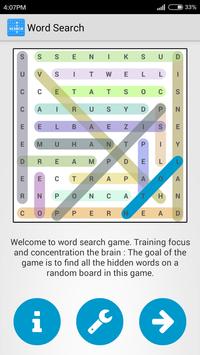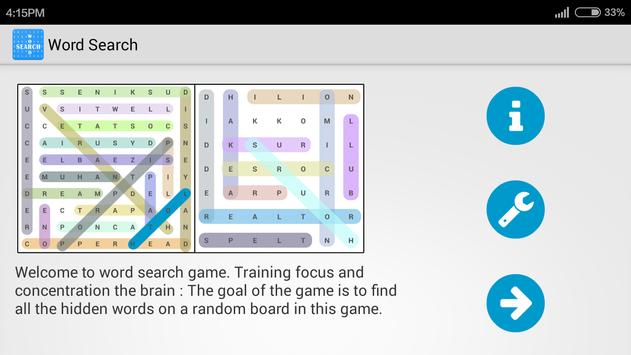 Word Search . Training focus and concentration the brain. The goal of the game is to find all the hidden words on a random board in this game. One of the best Word Search games, support all language in words. Select language for word list :