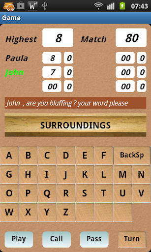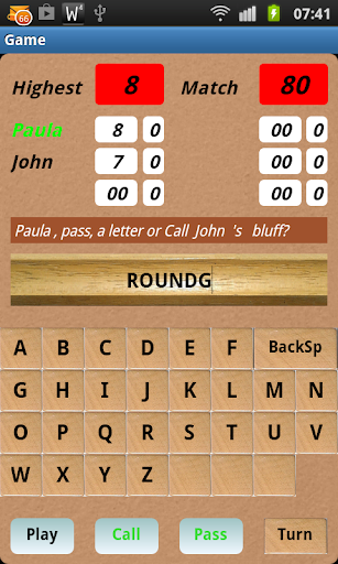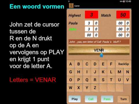 After the PLAY button is pushed,the computer checks if it's an existing word. If it is,the player gets a point for every letter of that word, if not he only gets a point for the one letter that he placed. After each player has passed or after the CALL button has been used, a new round starts and the