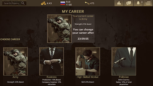 ✯ You will find different Career Modes in this World War Strategy Game - Politician (to become President of the country), Army (25% Attack Power Boost), Worker (25% Work Skill Boost), & Businessman (10% Less Gold for Company Creation & 10% Overall Productivity boost of all employees)