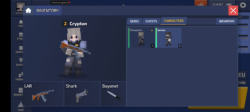 Pick your weapons loadout and character in your inventory. Buy chests to populate your inventory with more weapons and unique skins.