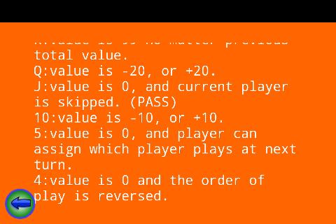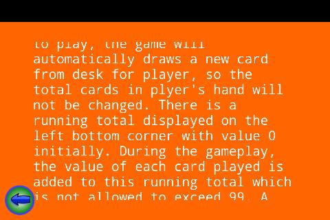 At the beginning of the game, five cards are distributed to each player, and remainder cards are placed on desk with backside up. The game is starting from human player and play in the count-clockwise order. After a player choose a card to play, the game will automatically draws a new card from desk for player, so the total cards in player's hand will not be changed. There is a running total displayed on the left bottom corner with value 0 initially. During the game play, the value of each card played is added to this running total which is not allowed to exceed 99. A player who cannot play without causing this total to surpass 99 is considered loser.