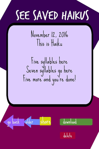When you click on the Submit button, your Haiku will be saved with the date. You can revisit, share, or download your Haikus from the See Saved Haikus page.