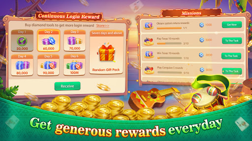 1. Login every day to receive login rewards, novice rewards, online rewards, and each mission to get a lot of chips.