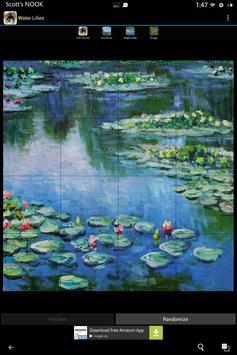 It works like this: first the masterpiece is converted to a grid with 3 rows of 3 pieces(Easy), 4 rows of 4 pieces(Moderate), or 5 rows of 5 pieces(Hard). Then it scrambles the pieces and removes one. Your job is to move a piece that is adjacent to the blank square into the blank square, then repeat until you have re-assembled the masterpiece.