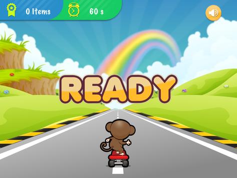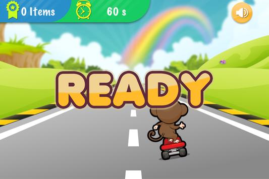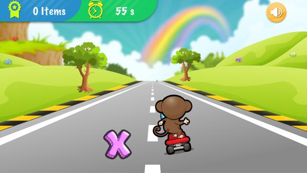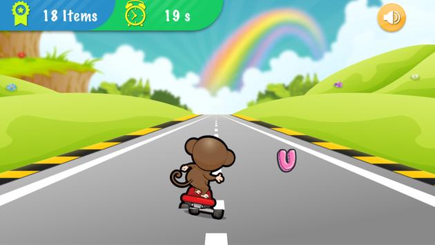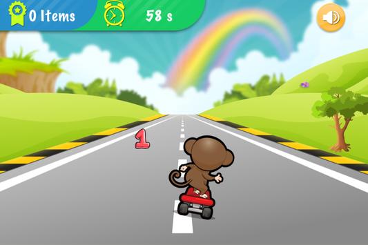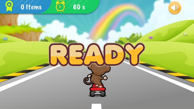 Go! Smart monkey! Get on the skateboard and start riding it on the highway full of English letters and numbers. No worry, they are not obstacles and it won’t be game over even you crash into them because you have to collect as many letters and numbers as possible within 60 seconds in this app oppositely.