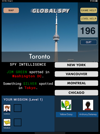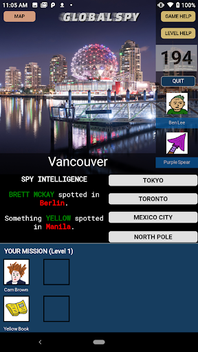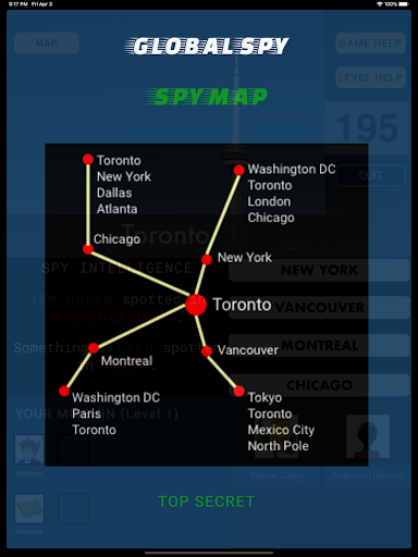 Your mission takes you to major cities around the world. Spies wander around freely, so the spy intelligence display within the game is essential for learning about sightings in different cities. At higher levels, even if you do find the spy you have been tracking down, that spy will sometimes elude capture at the last minute, escaping to a neighboring city.
