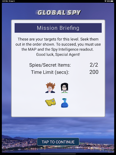 Like any good treasure hunt, Global Spy also requires you to locate the secret items mentioned in your mission briefing. Unlike spies, these secret items don't change location once the mission starts. There are between two and five spies per mission, and a corresponding number of secret items.