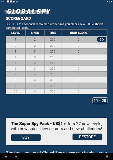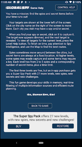 The first three levels of Global Spy are free, but an in-app purchase gets you a Super Spy Pack with 27 more levels, new spies, new secrets and new challenges.