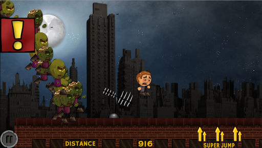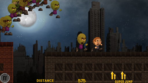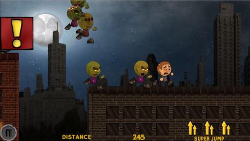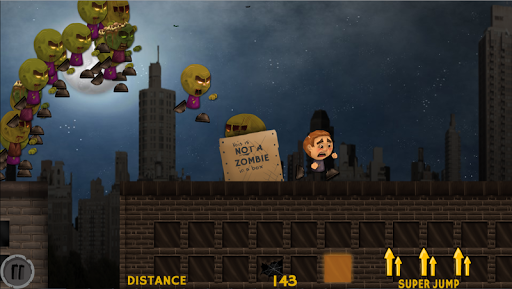 Controls are simple - tap the screen to jump to avoid the zombies. Tap when in mid-air for a super jump - useful to avoid the psycho zombies, big building gaps, or obstacles.