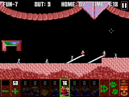 Builders: Builders can build an upward bridge at a 30 degree angle. They drop sixteen tiles of Lemmings so pay attention if you need to turn them into builders again.