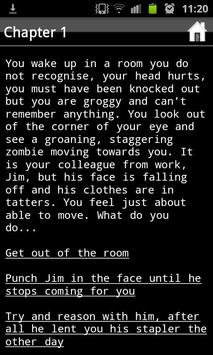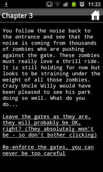 A choose your own adventure game where you have to try to survive the zombie apocalypse. You make the decisions that will keep you alive or get you eaten by a flesh eating zombie. The walking dead can spring up from anywhere and you need to have your wits about you. Will you stay away from the undead long enough to survive and make it to the extraction point? Will you get your brains eaten by the walking dead? With no survival guide you will have to fight a war against the undead using your instincts.