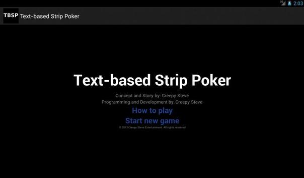 TBSP combines juvenile humor, literotica, and five card draw. Select from one of six playable characters (Grandma, a meth head, an overweight middle-aged woman, and more). You will play heads up until one player is naked. Outplay three characters and you are the text-based strip poker champion!