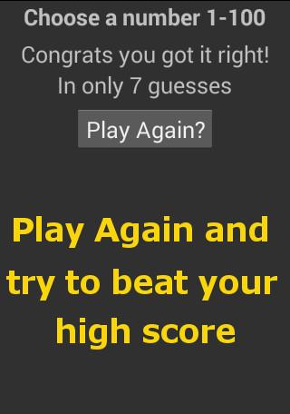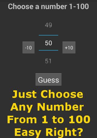 I'm an amateur programmer. Just one guy with a computer and a dream. This is my first of hopefully many apps posted here. It's simple but we all have to start somewhere. All you have to do is guess the correct number in the range from one to one hundred. The clues will help get you close. And when you get it right you get to start