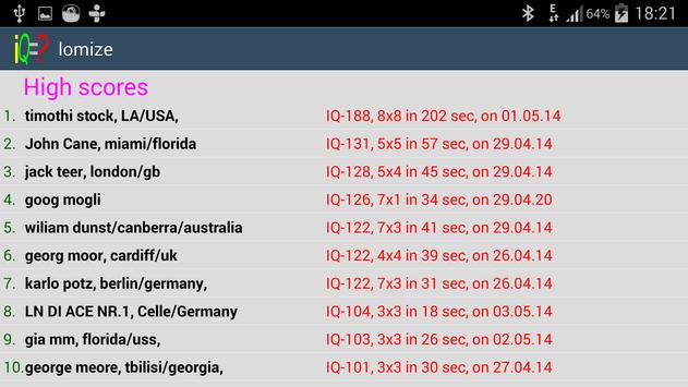 You can compare your acquired IQ points through the use of Internet-High score with the results of other players in the world. The IQ points are calculated according to a special formula and comply with the generally accepted framework from 80 to 250.