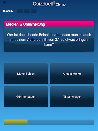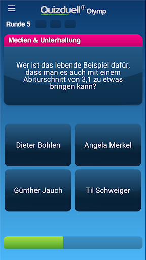 Al "Quizduell Olympus" puoi puzzle ogni venerdì durante lo spettacolo nel primo in cui due celebrità affrontano il Quiz Duel Olympus.Se l'Olympus può prevalere nei sei round con domande entusiasmanti di oltre 20 diverse categorie contro le celebrità, dieci attori dell'app riceveranno persino parte del profitto alla fine del programma tratto dal programma!