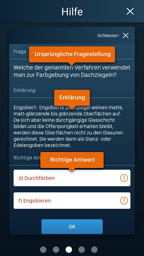 Über 500 Fragen aus den Bereichen Fachtechnik, Wirtschafts- und Sozialkunde und Allgemeinwissen warten darauf beantwortet zu werden. Im Lernmodus wählst Du einen der drei Themenbereiche und übst spielend, was Du später auf dem Dach wissen musst.