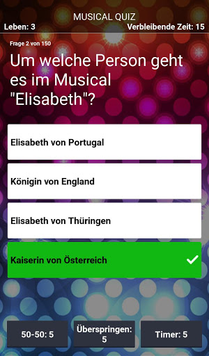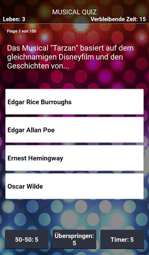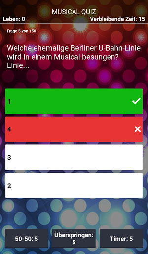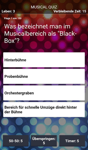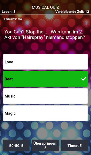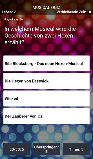 Jede Frage wird nach dem klassischen Prinzip mit vier Antwortmöglichkeiten vorgegeben, von denen aber nur eine richtig ist. Um deine Chancen zu erhöhen, kannst du einen von drei Jokern nutzen. Aber überlege nicht zu lange, denn der Timer tickt gnadenlos! Erreiche den Highscore der am meisten richtig beantworteten Fragen und teile ihn mit deinen Freunden per Google Play Leaderboard. Die Fragen mit ihren Antworten wurden von Musicalfans erarbeitet und geprüft. :)