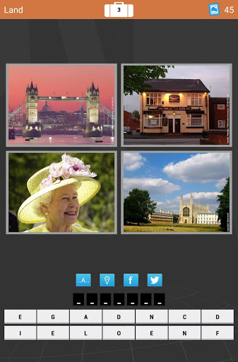 Dir werden 4 Bilder gezeigt und du musst den passenden Ort dazu finden! Schwelge in Urlaubserinnerungen oder begib dich auf die Reise in fremde Gefilde mit Fotos von Sehenswürdigkeiten, bekannten Gebäuden und Locations. Die Orte sind bestimmten Kategorien zugeordnet wie z.B. Stadt, Land, Bundesland, Insel, Kontinent, Freizeit, Arbeit und Sehenswert. In Updates kommen noch mehr dazu.