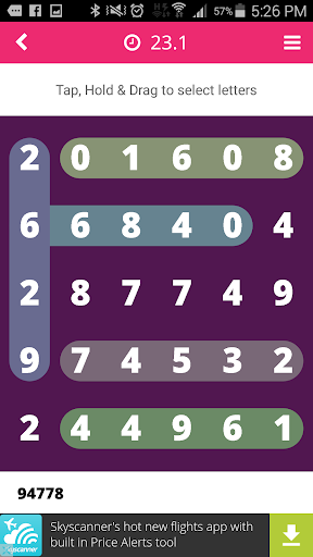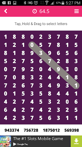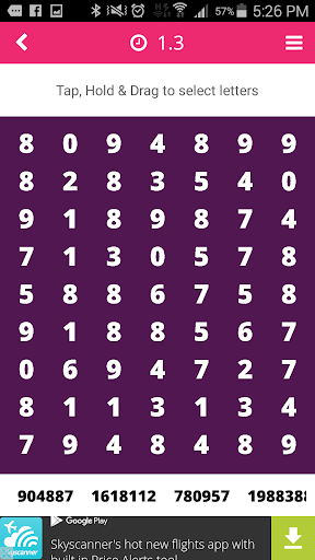 Using numbers and Maths you will have to use the list of given numbers at the bottom of the screen and then try to locate them in the jumbled up numbers on the game board. Once you have located one tap the screen and drag your finger across until you get to the end of the number sequence. Then move on to the next!