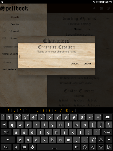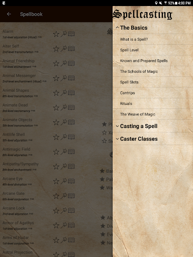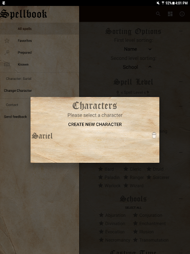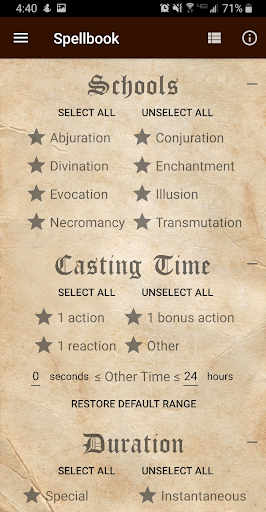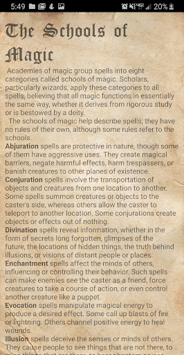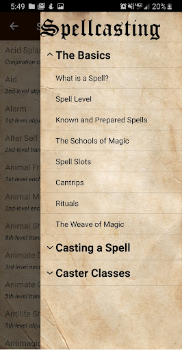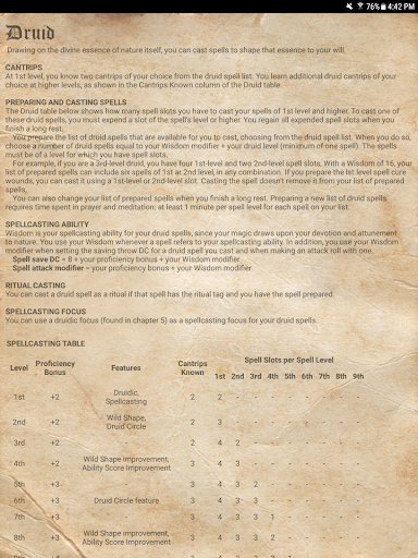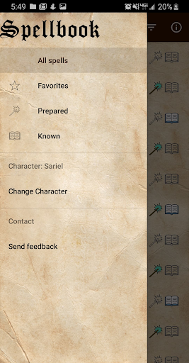 This app provides a lightweight, convenient, and ad-free way to manage your Dungeons & Dragons 5th edition spellbook and determine relevant spell properties while playing. Separate lists of favorite, known, and prepared spells can each be kept for multiple characters. No network connection is required.