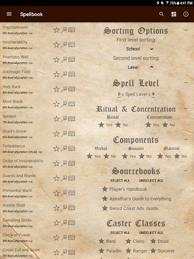 Spells can be searched by name for quick access. You can also sort and filter the spells by a variety of options. Sorting is two-level, with the option to set each level to ascending/descending. Sortable fields include: