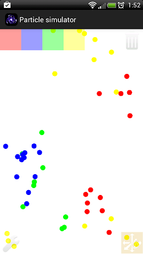 This app allows you to test some the interaction between different types of particles customizing the behavior they have between one another. You can choose if each type attracts, ignores or repels with other type or particles or even between the same type.