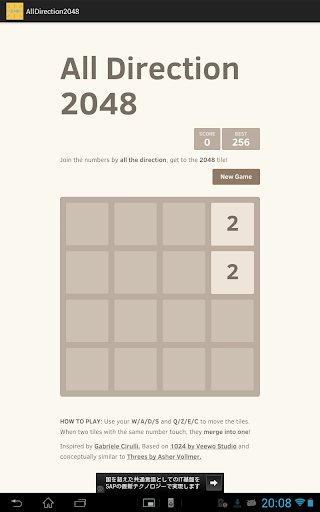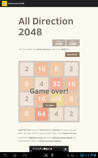 Inspired by Gabriele Cirulli(http://gabrielecirulli.com). Add movement in diagonal line direction. So we can now move in all direction! Play the game more easily and get 2048 for everybody!