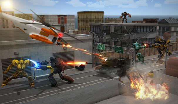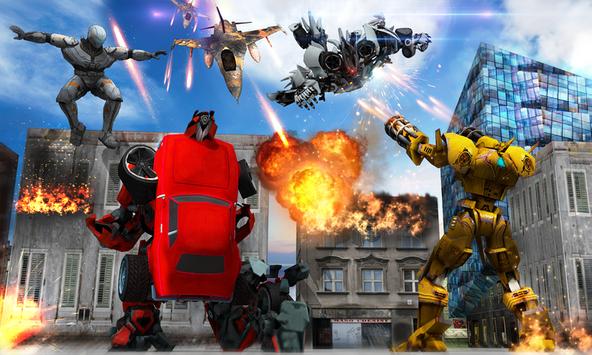 Robot Transformation fight is full of surprise and new levels. With latest and updated features amazing sound effects of metal to metal clash and smashing huge robots in tall buildings. We are featuring the best of transforming robots which can be transformed into dangerous vehicles with fire blasters and deathly machine guns. Blast away your enemy with powerful guns and firepower and transform into death machines. Unlock the special elite battle airplane jet fighter transform and fight it on more advanced level game mode.