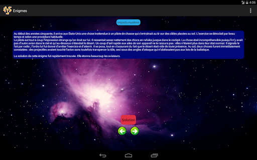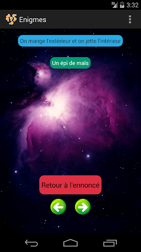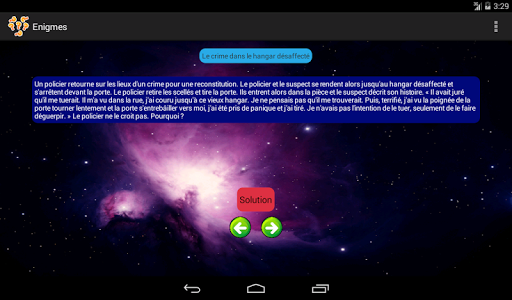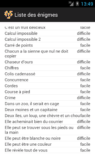 Cette application vous offre un panel important d'énigmes qui vous tortureront le cerveau ! Les énigmes sont de différentes difficultés et genres. Vous n'avez pas de temps prédéfini pour y répondre et pouvez voir la réponse à tout moment.