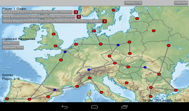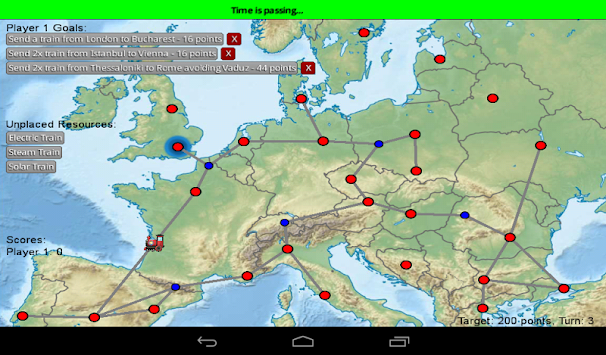 Taxe is a two player, turn-based Player versus Player (PvP) game in which players plan and route trains across Europe, competing to become the greatest train company of all time! Race your opponents by deploying trains to complete journeys between European stations based on goals, acquiring points as you complete each. Create your own routes to stations by adding or removing tracks between cities to improve your chances or hinder your opponents. Replay your last moves using the replay system for a recap of what previously happened. The player to reach a score of 200 points first wins, but be careful! Obstacles (junction failures and natural disasters) may hinder your progress!