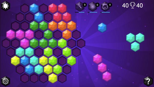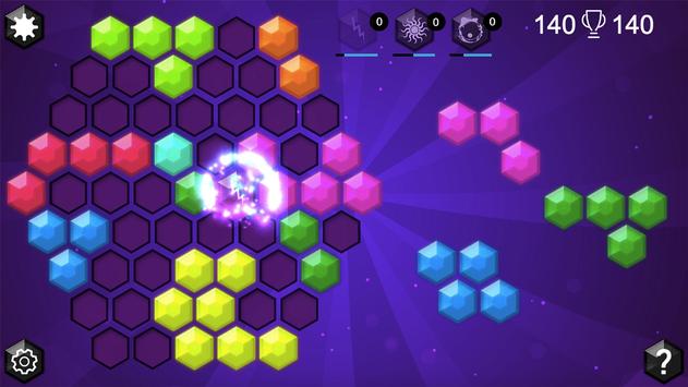 Drag the hexagon blocks to create and destroy full lines on the screen in any of the primary three directions. You will get amazing combo bonuses by destroying multiple lines at the same time.