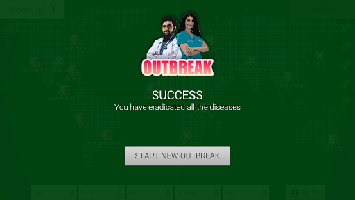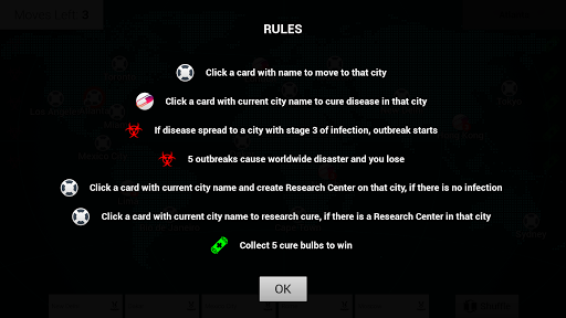 Outbreak is a turn-based card strategy game. You have a deck of 5 cards with city names and 3 actions each turn. Use a card to travel to selected city, or treat the infection in city with card matching the city you are currently in. If the city is free from the infection, use the card with its name to build a Research Center, or to develop a cure, if the Research Center already built. Conduct 5 cure researches to win the game.