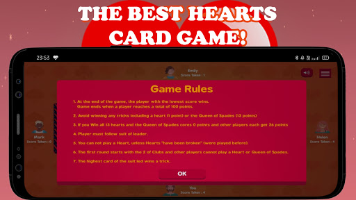 🔴 Don't worry if you don't know the rules of Hearts Card game. You can refer to the rules list via Menu.