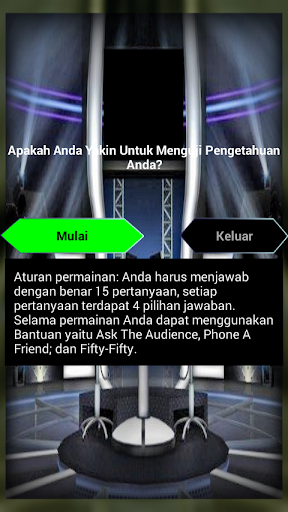 Sama halnya dengan Kuis Millionaire Konvensional. di aplikasi ini, pemain ditantang dengan 15 Pertanyaan dan 3 bantuan diantaranya :