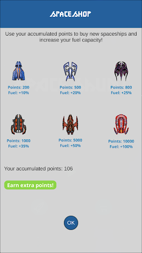 - Use your accumulated points to buy new spaceships with more fuel capacity
