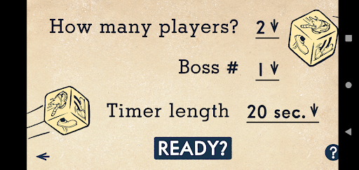 Use this app to conveniently keep time and calculate scores for your Rounds! Start by setting a player count, Boss #, and timer length on the next screen. Once your Attack Cards are revealed, start the timer. A brawl is surely brewing!