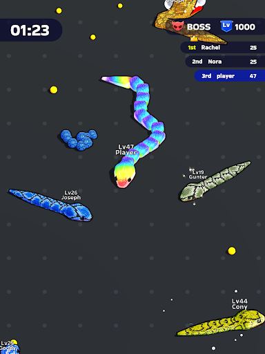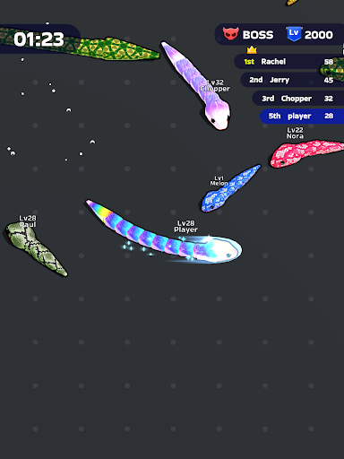 The journey from a small worm to a large snake is challenging, but achievable! Hunt down snakes with lower levels than yours to become bigger and more powerful. All other snakes are potential prey for you to eat! Keep an eye on how this worm's arena becomes a fierce snakes battle zone.