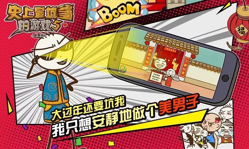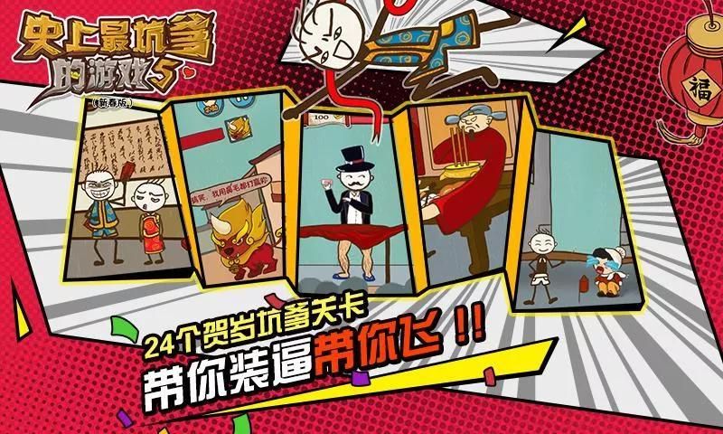 《史上最坑爹的游戏5》是“坑爹游戏”系列针对2015年新年所推出的坑爹游戏新春版。游戏中除了有传统“坑爹系列”的24个坑爹关卡外,还加入了各种接地气的新春元素,让玩家在游戏过程中充分体验到过年才有的各种搞笑趣事:抢红包、贴春联、放烟花……