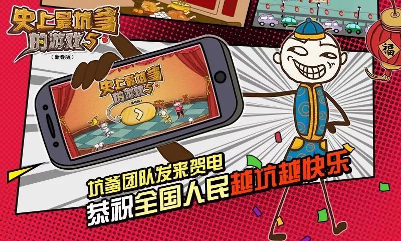 "History of the pit father of the game 5" is the "pit father game" series for the 2015 New Year launch of the spring edition of the game pits father. Game, in addition to the traditional "pit father Series" of 24 pit father checkpoints, but also adding a variety of ground gas spring elements, allowing the player during the game to fully experience the New Year have all kinds of funny anecdotes: grab a red envelope, couplets ,light fireworks……