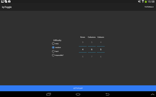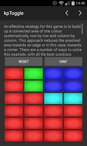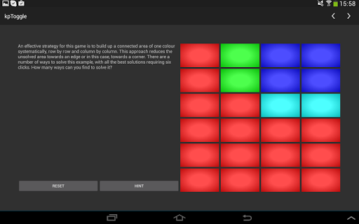 Can you change all the squares to the same colour, using just such a simple interaction? You can determine the complexity and the size of the game, so it may last just a few seconds or perhaps a few hours, or for those who like a challenge, see if the "impossible" is actually possible.