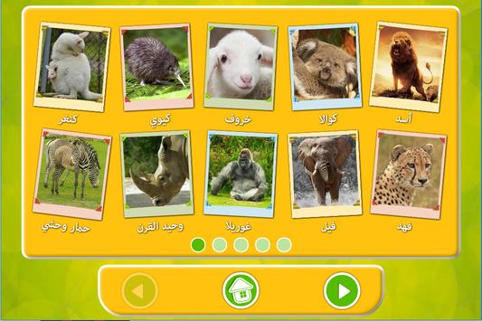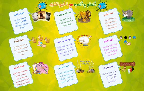 learn and play with animals (9 in 1) 1. Images gallery 2. animals and there sons 3. animals and food 4. animals and numbers 5. animals dot to dot 6. animals complete the pattern 7. coloring book 8. arabic alphabet 9. story
