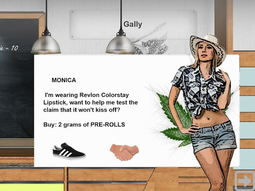 - Roll a Joint Room - greet customer with a joint; make sure you don't ask for more. (don't give Nina free weed)