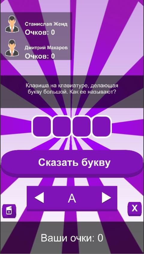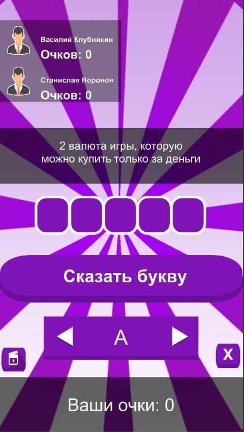 Игра где вам нужно отгадывать слова, кроме вас в игре будут боты, которые тоже буду отгадывать слова и могут выиграть. Тот, у которого больше очков тот и выиграет. В игре всего 100 слов!!!