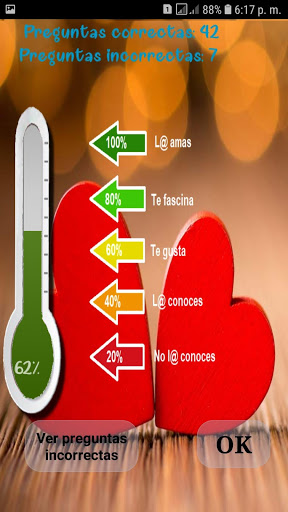 Al final de que tus amigos o pareja responda saldrán los resultados en forma de porcentaje acompañado de un termómetro también podrás ver las preguntas incorrectas