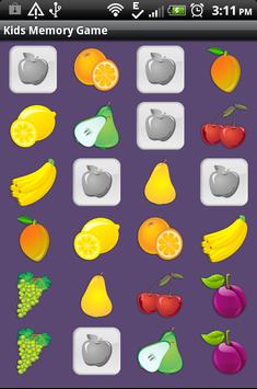 Kids Memory Game to sharpen your child's memory and intellect. This app lets you to create different memory match games with unlimited number of game modes. It has memory games like fruits memory game, cars memory game, foods memory game, and more.