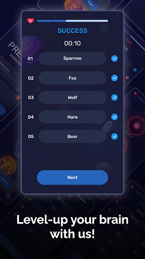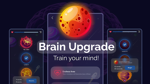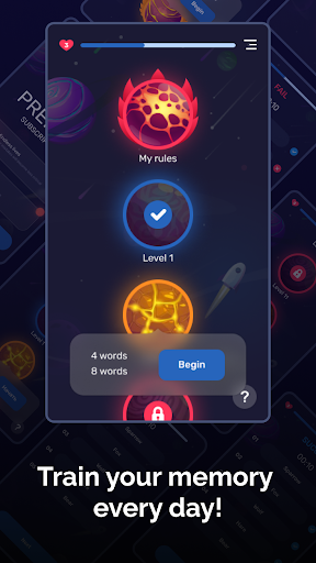 Brain training in our mind games have been developed to achieve maximum efficiency. A special brain simulator for memory training, improves its computing abilities, gamifies and pumps up your memory in the most effective way. Using the latest research in the field of memory development, we went through all possible brain games for adults and kids, all apps for development, brain skills improvement, and we chose the most effective type of brain stimulating games - you need to memorize words and reproduce it from memory in a short time. This is a real brain booster, much more effective than most other games for memory apps that we have tested in the course of creating ours.