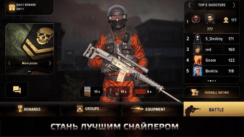 Clans and groups. Team up to 6 people to participate in group battles and operations. Or create clans for up to 50 people and experience the full scale of the sniper battle. True, these modes are not available without the Internet.