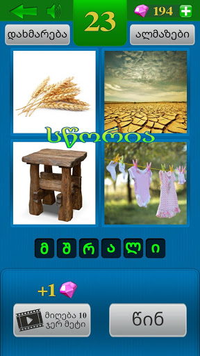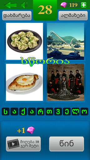 მსოფლიოში ცნობილი "4 სურათი 1 სიტყვა" თამაშის ქართული ვარიანტია. ყოველ ეტაპზე წარმოდგენილია 4 სურათი. მოთამაშემ უნდა იპოვოს 4 სურათის გამაერთებელი და საერთო სიტყვა. 4 surati 1 sitxva, otxi surati erti sitxva